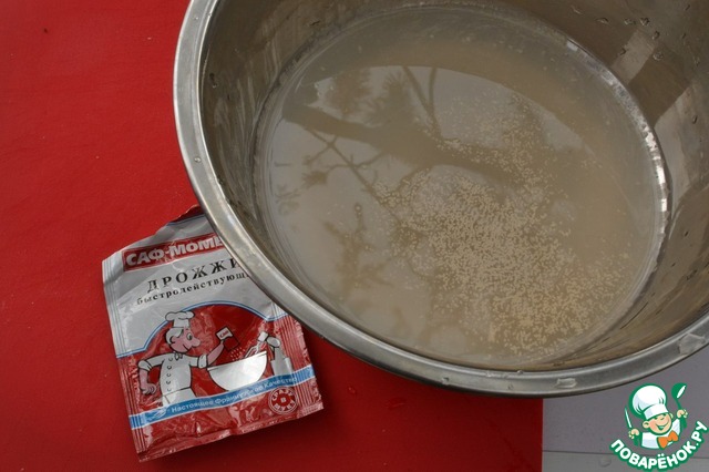 Итак, теплая вода, сахар и дрожжи первыми отправляются в миску. Даем дрожжам разойтись буквально пару минут. -