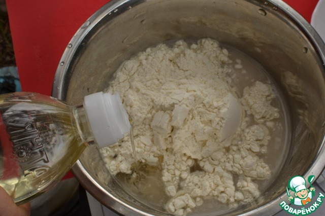 Затем добавляем муку (это тесто я делаю немного покруче, чем обычно, поэтому муки побольше), подсолнечное масло и соль. И хорошенько вымешиваем эластичное тесто.