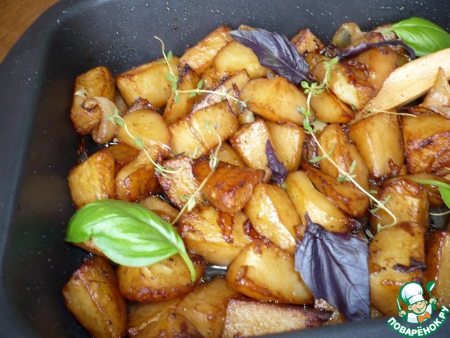 Затем увеличить огонь до температуры 230 градусов, снять фольгу, поперчить, влить соевый соус "Kikkoman" и добавить веточки свежего тимьяна. Запекать еще 30 минут, постоянно перемешивая.