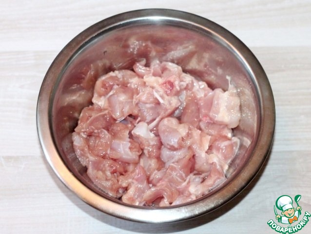 2. Приготовим куриную начинку. С двух окорочков снимаем шкурку и удаляем косточки. Нарезаем куриное филе маленькими кусочками.