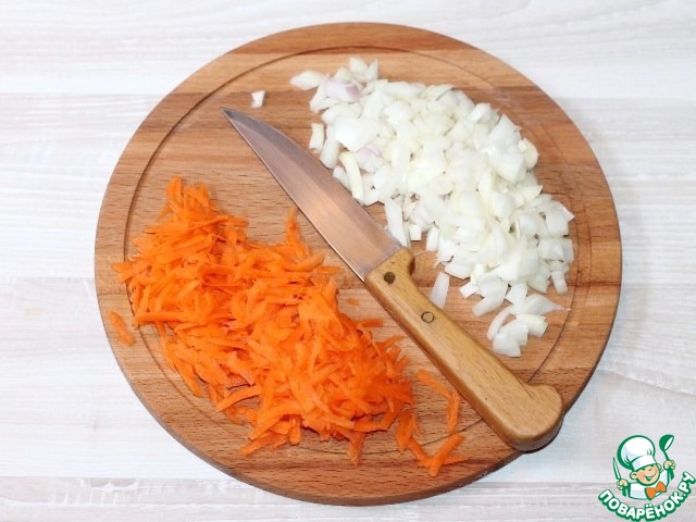 3. Репчатый лук очищаем и нарезаем маленькими кубиками. Очищенную морковь натираем на крупной терке.