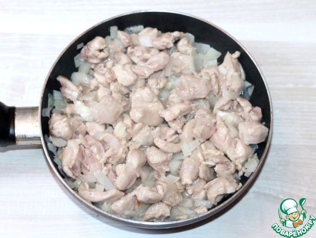 4. Обжариваем куриное филе на разогретом растительном масле (2 ст. л.) с добавлением репчатого лука.