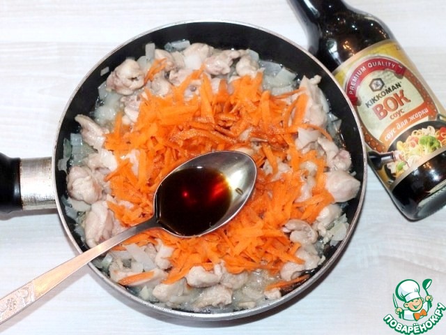 5. Затем добавляем сливочное масло, соус для жарки "Вок" (2 ст. л.) и тертую морковь. Готовим до мягкости моркови. Начинка готова!