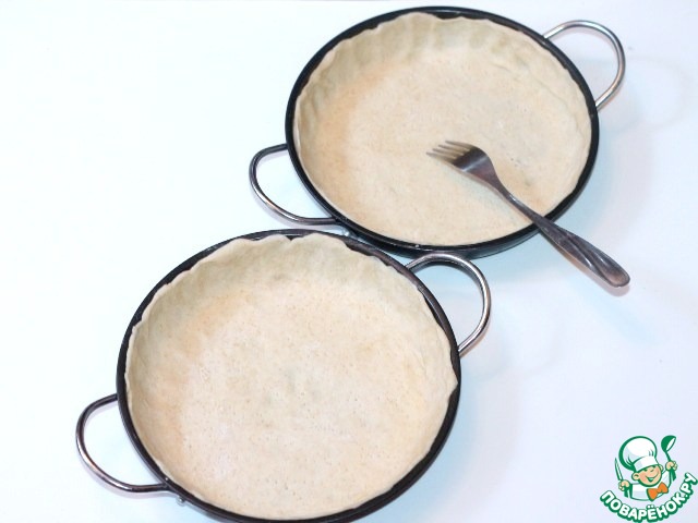 8. Формочки для выпечки (2 шт = Ф 18 см) смазываем сливочным маслом. Из каждой половинки теста раскатываем круг (2 шт). Выкладываем круги теста в формочки для выпечки и формируем бортики. Протыкаем тесто вилкой.