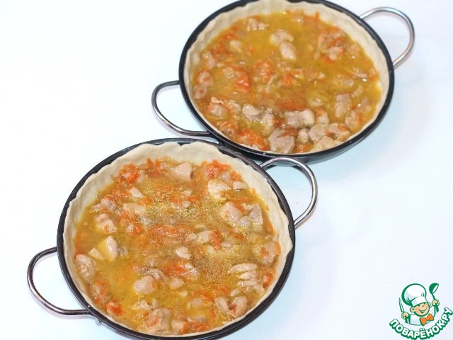 9. Выкладываем на тесто куриную начинку. В стакане теплой воды размешиваем бульонный кубик, и выливаем в каждую формочку по 1/2 стакана.