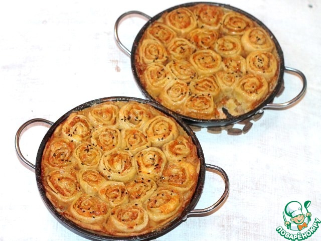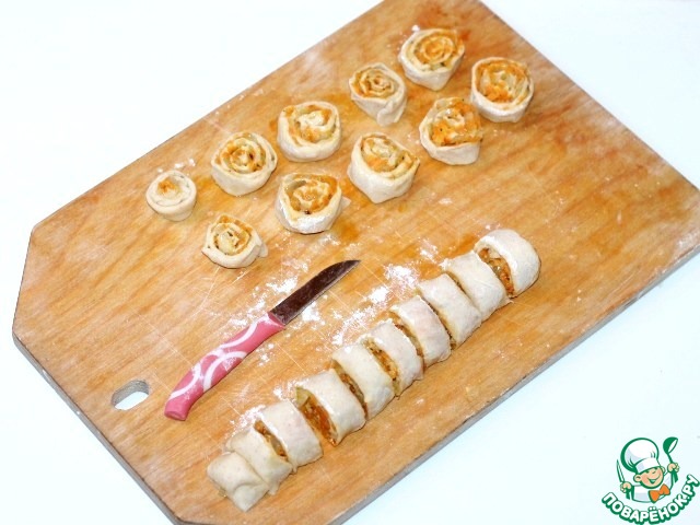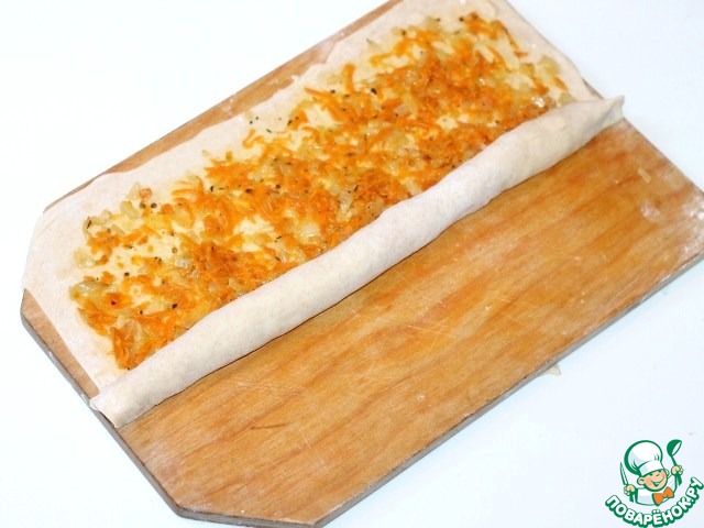 10. Оставшиеся 2 части теста тонко раскатываем (толщина = 2 мм) в прямоугольники (26*40). Выкладываем на прямоугольники луково-морковную начинку и плотно скручиваем тесто в рулет. Я в одну часть прямоугольника добавила 2-3 ст. л. мягкого сыра.