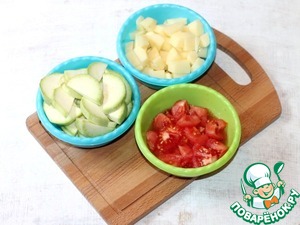 3. Кабачок порежьте дольками. Картофель порежьте кубиками. У помидор сделать на кожице крестообразный надрез, ошпарить кипятком и разрезать на части.