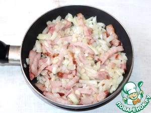 4. Грудинку порежьте небольшими полосками и обжарьте на разогретом растительном масле (1 ст. л.) с мелко порубленным луком и чесноком. Затем добавьте 1 ст. л. соуса "Вок" и жарьте еще 1-2 минуты.