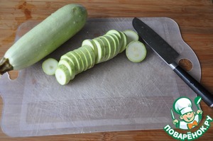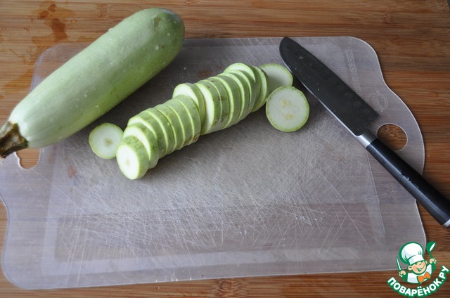 Берём молодой кабачок, режем тонкими кольцами толщиной около 0,5 см. -