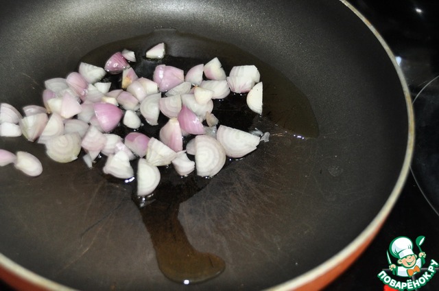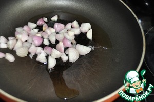 Репчатый лук режем мелкими кубиками и обжариваем до прозрачности на растительном масле на среднем огне.