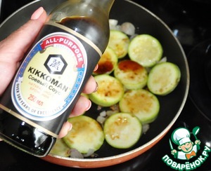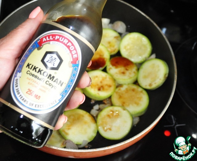 Поливаем кабачки с луком соевым соусом ТМ Kikkoman.
