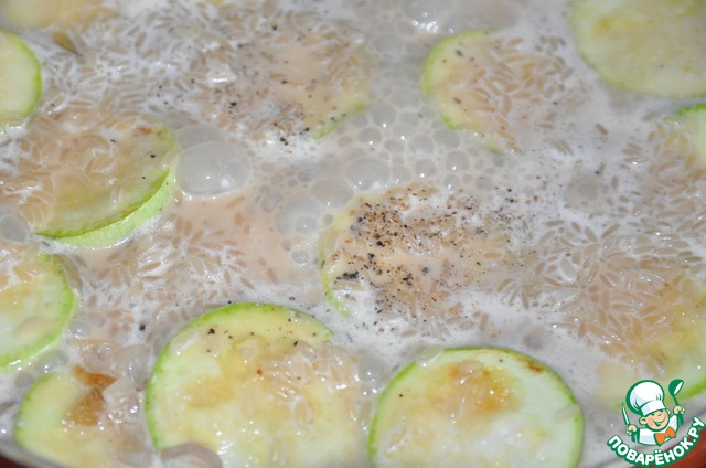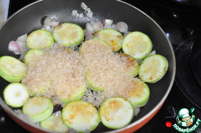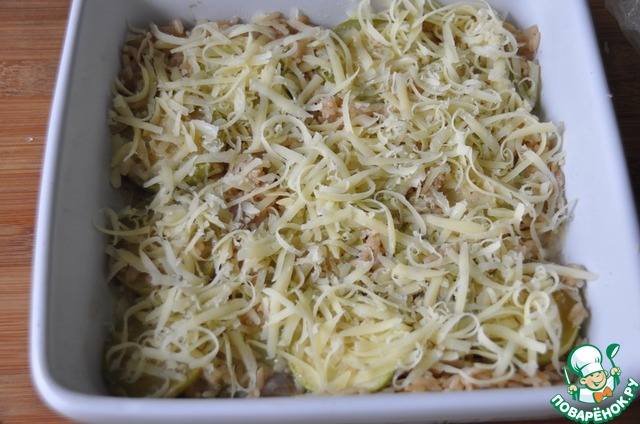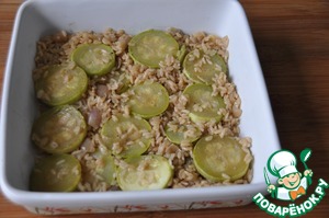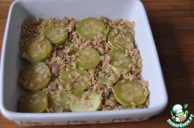 Берём форму для запекания, кладём в неё кабачки с рисом так, чтобы большая часть кабачков была сверху. В смеси должно оставаться немного жидкости, чтобы рис не был сухим. Если жидкости нет, добавьте немного бульона.