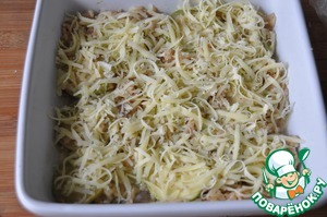 Сверху посыпаем твёрдым тёртым сыром, в оригинале эмменталь или чеддер.