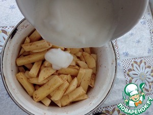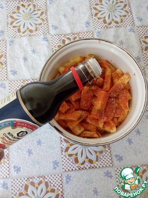 Картофель чистим, моем, нарезаем соломкой. Добавляем паприку, сумах, соль, соевый соус, хмели-сунели и тщательно перемешиваем.
