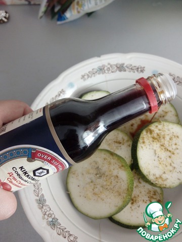 Кабачки моем, режем на кружочки. Приправляем соевым соусом, розмарином, солью.