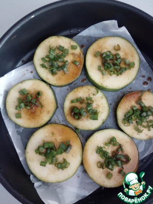 На дно противня выстеленного пергаментом и смазанного маслом, выкладываем кабачки (можно полить их сверху маринадом), а на них мелко порезанный лук.