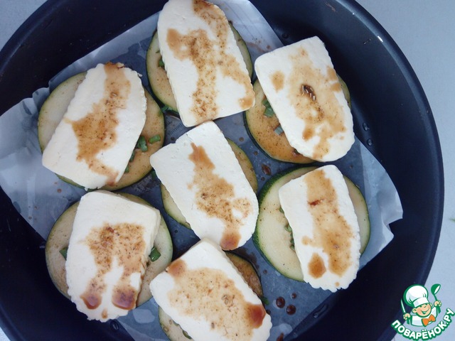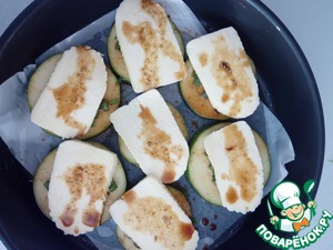 Сыр режем на кусочки толщиной 2 мм (примерно)или можете потереть на терке. Укладываем сыр поверх лука (я еще полила оставшимся маринадом). Запекаем в духовке при температуре 180 градусов, до мягкости кабачка.