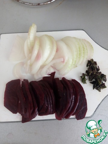 Свеклу и лук очищаем, режем полукольцами. Базилик мелко режем.