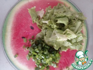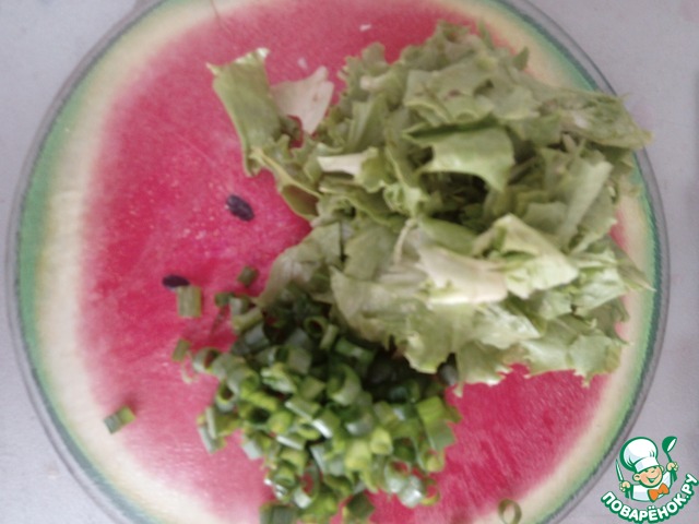 Листья салата, моем, обсушиваем, рвем на кусочки. Зеленый лук мелко режем.