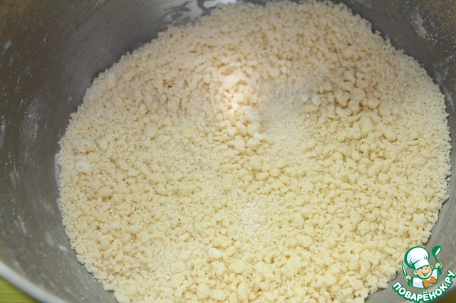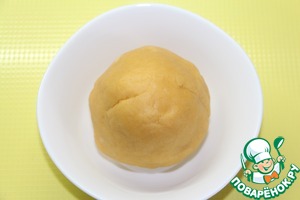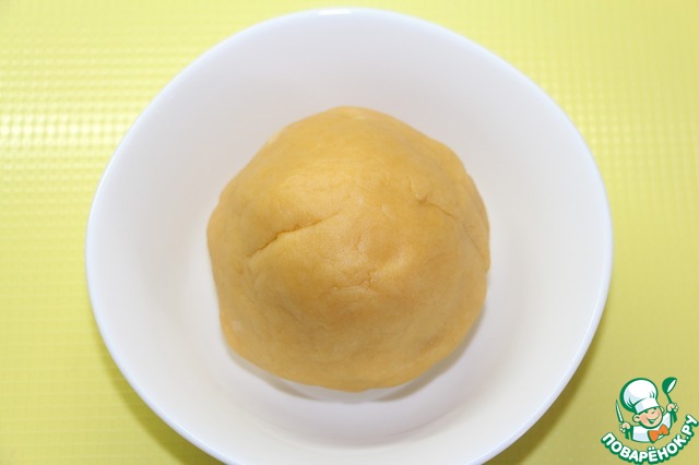 Скатать тесто в шар, собирая все мелкие кусочки, чтобы тесто стало гладким, положить тесто в холодную чистую миску, закрыть пленкой и убрать в холодильник на 30 минут.