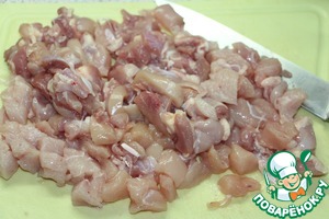 Выложить куриное филе с зеленью. Готовить начинку на сильном огне 5-7 минут, до полного испарения жидкости. Начинку остудить.