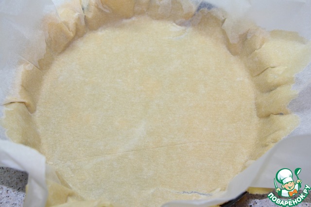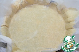 Перенести тесто на пергаменте, как на подносе в форму и аккуратно опрокинуть его, прижать пальцами...