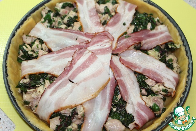 Поверх бекона выложить куриную начинку, равномерно распределить ее и накрыть свисающими краями. Прикрыть пирог фольгой и поставить в разогретую до 160 градусов духовку на 1.5 часа.