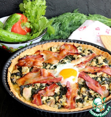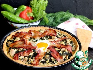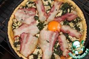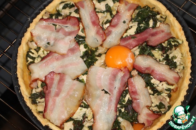 На охлажденную основу выложить длинные полоски бекона так, чтобы они свисали за края формы и потом прикрыли всю начинку сверху.