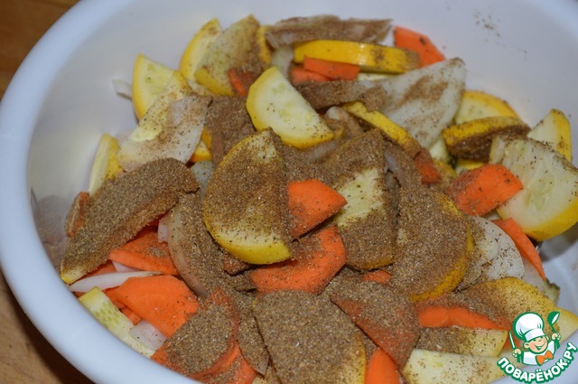 Сложить нарезанные овощи в глубокую миску, посыпать приправой для моркови по-корейски и перемешать.