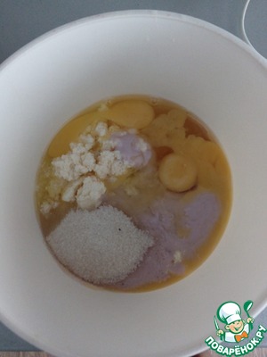 Творог, яйцо, сахар и йогурт перемешиваем миксером (можно венчиком).