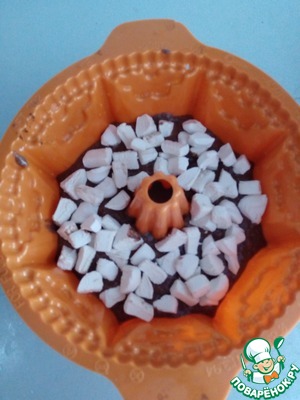 Выливаем половину теста в форму для запекания, пересыпаем зефиром порезанным кубиком.