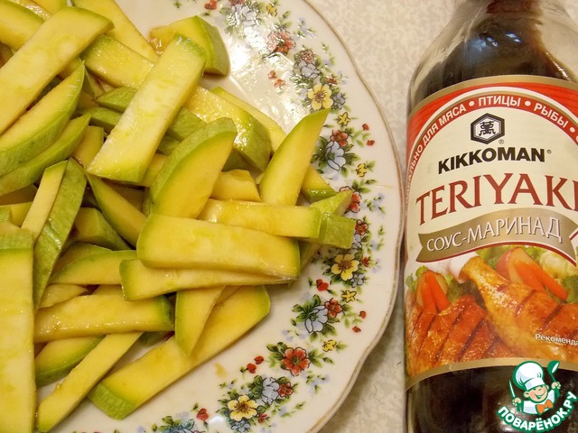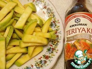 Цуккини порезать брусочками, добавить 1 ст. л. соевого соуса ТМ" Kikkoman" и перемешать. Баклажан очистить от кожуры, порезать брусочками, посолить и оставить все овощи на один час.