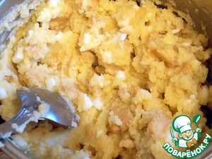 Смешать картофельное пюре, обжаренную грудку и мелко резанные яйца. Хорошенько перемешать.