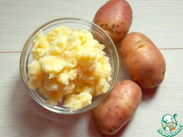 Картошку помыть, почистить, сварить в соленой воде до готовности. Слить воду и помять картошку до нежного пюре. Яйца сварить.