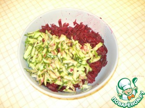 На крупной терке натираем свеклу и огурец (в зависимости от порции конечно количество продукта строго индивидуально, я бы даже сказал половинку средней свеклы и 1 средний огурец).