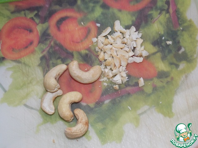 Орешки кешью мелко нарезать (если у вас не обжаренные орешки, предварительно слегка обжарить на сухой сковороде).