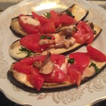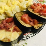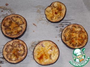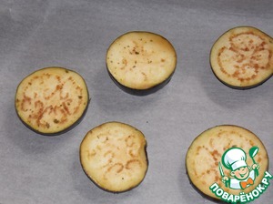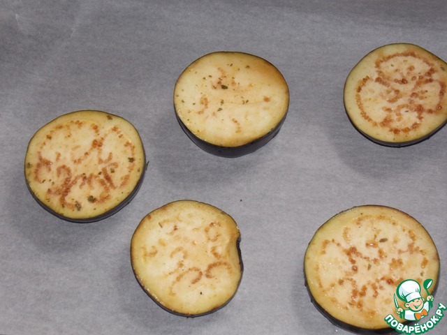 Выложить баклажаны на противень, застеленный пергаментом и запечь при 180 С, в течении 5-7 минут.