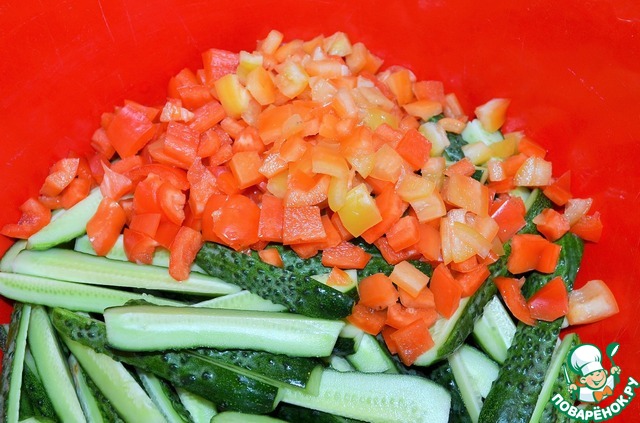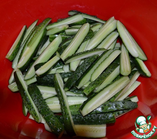 Осмелюсь предложить еще одну заготовку. Салат из огурцов и болгарского перца. Рецепт выработан на основе классического салата "Дамские пальчики", часть огурцов заменила на сладкий перец. Закуска стала ярче и на вид, и на вкус. Как мы зовем в семье "Дамские пальчики с маникюром". Угощайтесь.