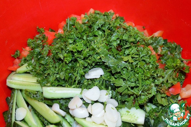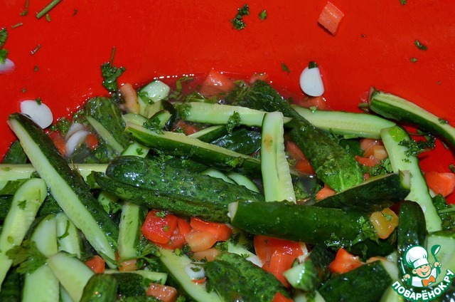 Овощи просолились, дали сок - самое время влить масло и перемешать.