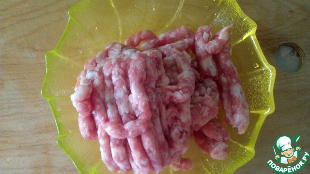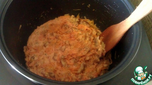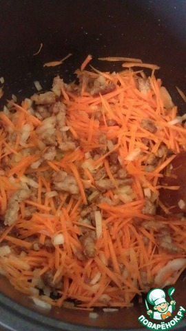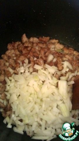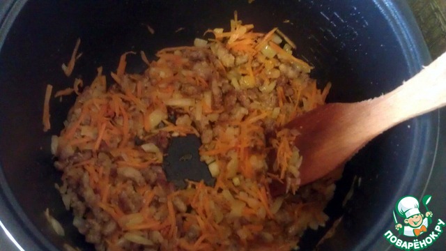Выставляем на мультиварке режим "Жарка" 12 минут. Наливаем растительное масло. Забрасываем фарш и жарим его 6 минут. Фарш помешиваем.