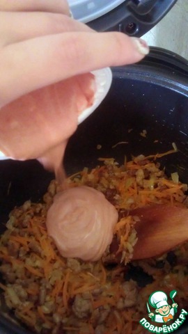 Отдельно смешать томатную пасту+сметану+ 50 мл. воды и отправить к зажарке.