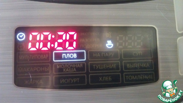 1 стакан гречки: 2 стакана воды. Добавляем соль, перец и любимые травы. Я добавила карри. Выставляем режим "плов" и ждем 20 минут -