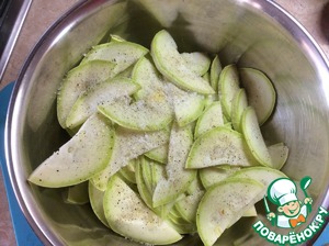 Нарезаем кабачок, так как он у меня крупный я нарезала полукольцами. Добавляем по вкусу соль и перец.