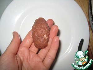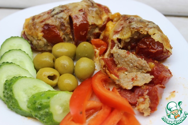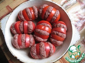 Формируем из фарша вот такие небольшие котлетки и помещаем их в разрезы помидоров.