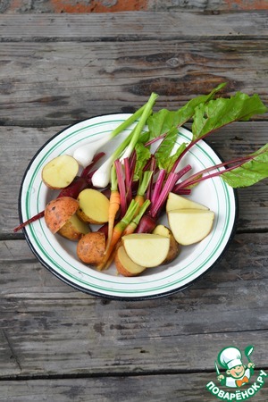 Если овощи молодые, то их нужно просто хорошо помыть, а шкурку лучше не чистить. Картофель у меня был крупный, я его разрезала на части. Если картофель мелкий - оставьте его целиком
