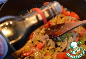 Выложить к овощам, влить соевый соус,