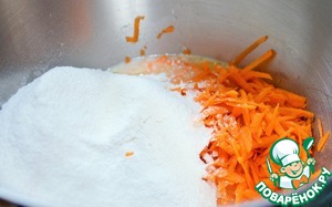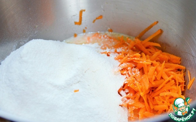 Добавить просеянную муку, тертую морковь.
