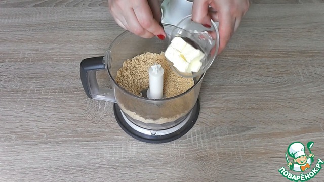 • Делаем основу торта. Измельчаем печенье в блендере и добавляем туда масло. Ещё раз размешиваем.