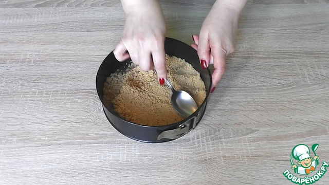 • Ставим на блюдо бока от разъёмной формы (d 20-22 см) или кулинарное кольцо. Равномерно распределяем крошку по дну, утрамбовываем. Отправляем заготовку в холодильник.