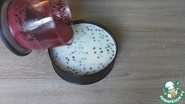 • Делаем заливку. Желатин заливаем горячей водой. В блендере измельчаем чернику с сахаром. Добавляем желатин и перемешиваем ложкой. Заливаем застывший торт и снова отправляем его в холодильник.